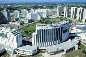 亚运村是于1990年为迎接第十一届亚运会而兴建。它由国家奥林匹克中心、亚运村和住宅小区等组成。奥林匹克中心有号称“亚洲第一馆”的游泳馆和综合体育馆,两馆外形相似,银灰屋顶、塔筒高耸,给人以奇特脱俗之感,此外,还有现代化的田径场、曲棍球场,体育博物馆和武术研究院及垂钓中心等。在它的周围还建有国际会议中心、五洲大酒店、汇宾大厦、汇园公寓,购物中心,汇珍酒楼、康乐中心和国际小学等,已成为一座集会议、展览、办公、居住、美食、游乐、购物于一体的“城中之城”。
