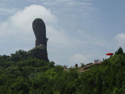 磬锤峰,古称石挺,俗称棒槌山。早在1400多年前,北魏著名地理学家郦道元在《水经注》中就有记载,称其“孤石云举,临崖危峻,可高百余仞”。经实际测量,磬锤峰海拔596.29米,槌高38.29米,连同基座高59.42米,上部直径15.04米,下部直径10.7米,体积约为6508立方米,重约16205吨,估计已有300万年的高龄。峰槌半山腰有一株桑树,高约3米,大约有300多年的树龄。
