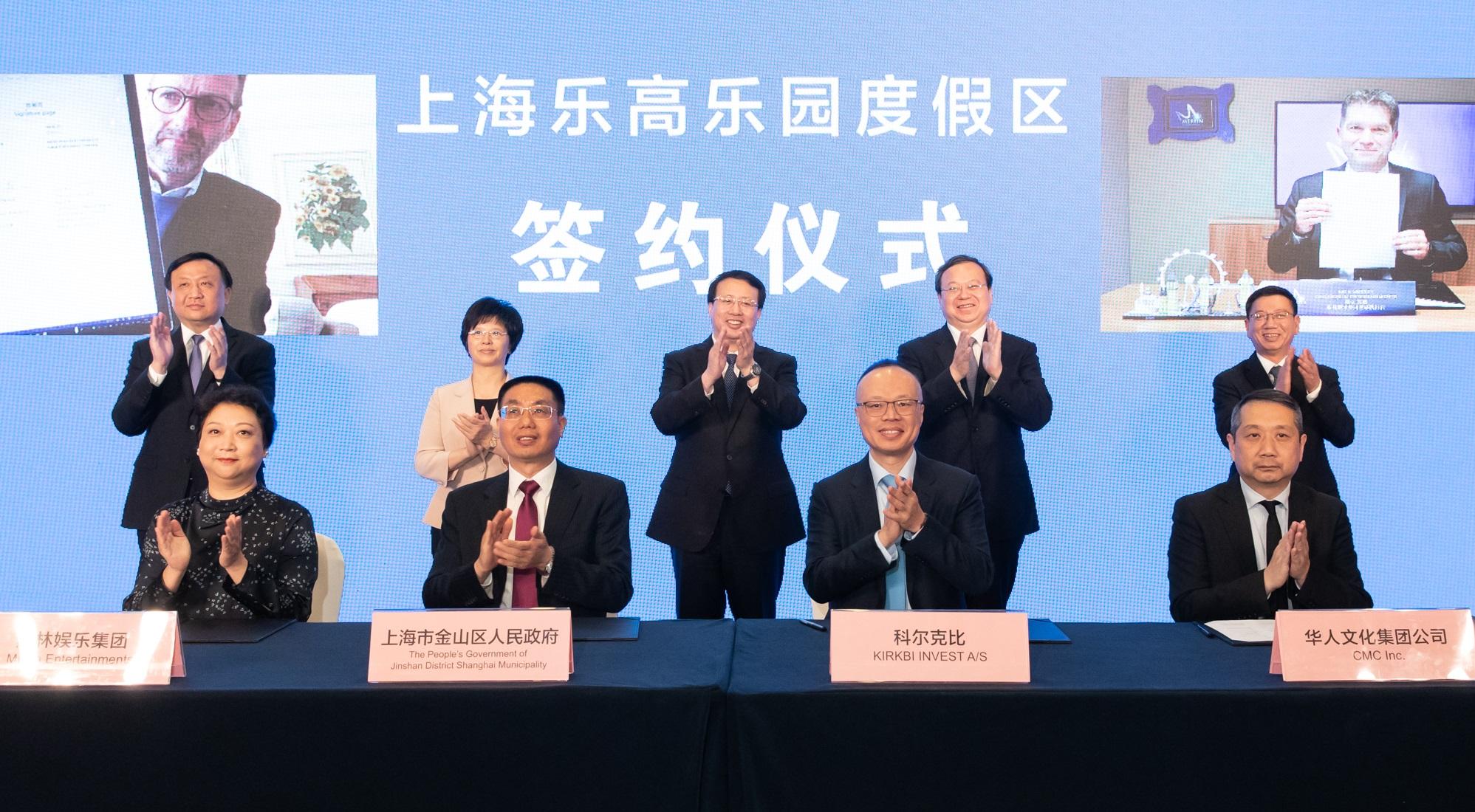 上海乐高乐园度假区项目签约仪式2020年11月6日在上海举行,上海市金山区人民政府、英国默林娱乐集团、丹麦乐高品牌集团、华人文化集团公司四方通过线上线下互动的方式完成签约。