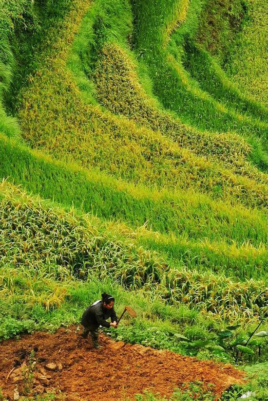 在这里顺势而上,你还会看到苗族儿女正在耕耘,辛勤的她们,用智慧,创造了这绝美的景色,也感受着收获的喜悦。