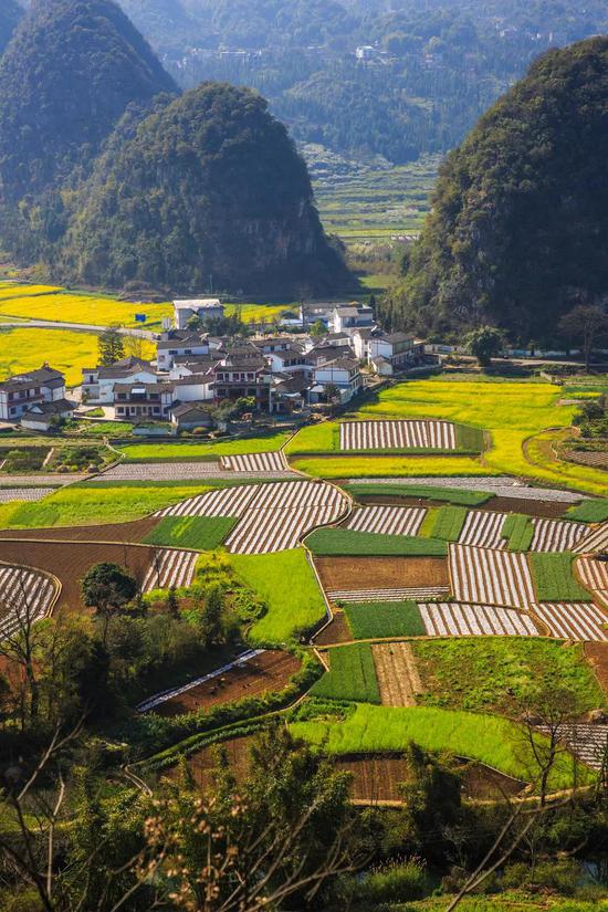 春天的万峰林,是一片金黄色,村庄也被这油菜花染上了色彩。驾车经过,都忍不住要停下,甚至有些羡慕这里的人家。